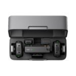 Built-in rechargeable batteries on each transmitter and receiver offer long operating times of 11.5 and 10.5 hours, respectively. Charge the units for just five minutes for an additional 1 hour of use when both are depleted. The included charging case can replenish the entire system 3.6 times for a total extended battery life of 48 hours. In the DJI Mimo app, you can toggle auto power off for the system, causing both devices to automatically shut down after 15 minutes if not connected, preserving your battery life.
